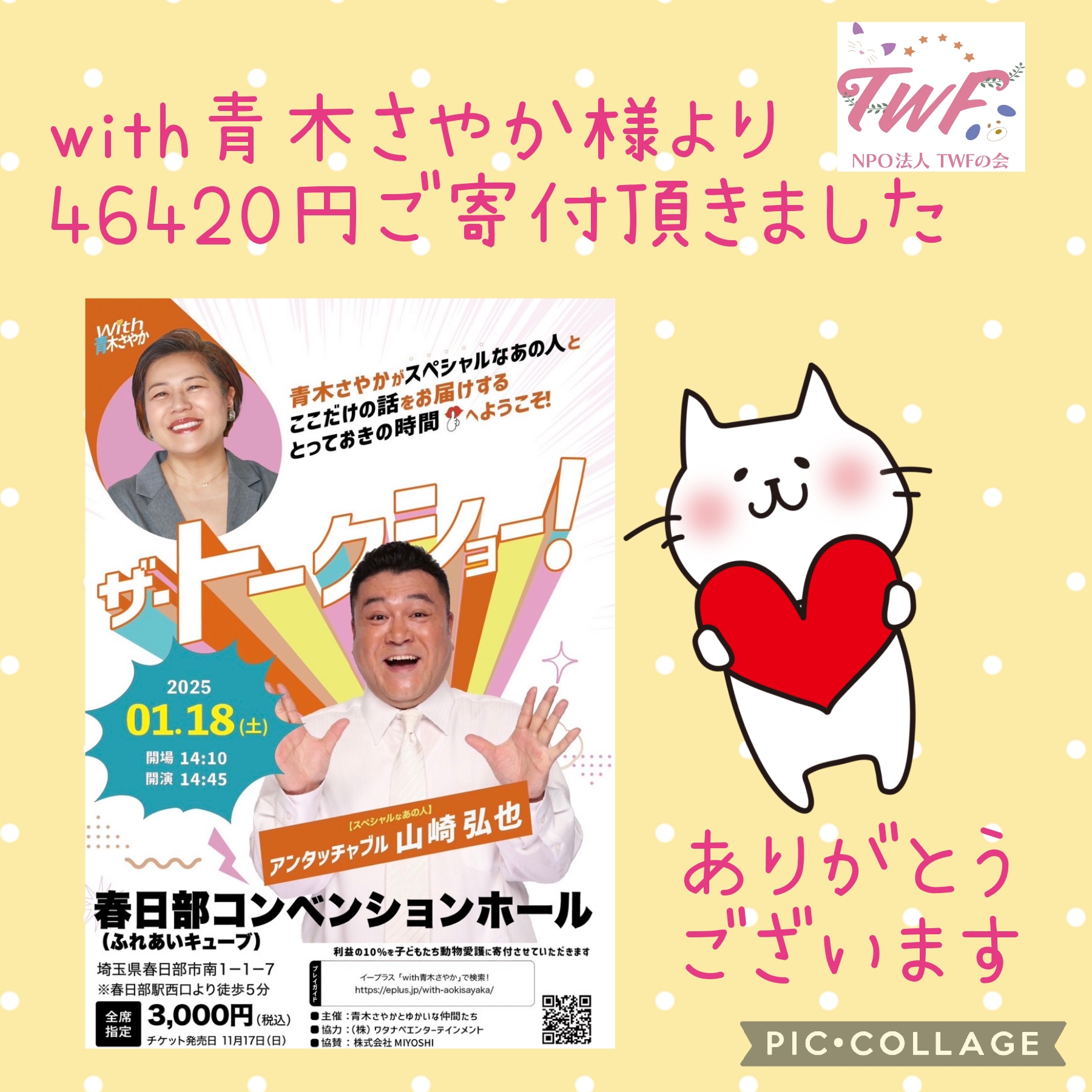 with青木さやか様よりご寄付頂きました 2025 5/11 INFORMATION Thanks! 2025年5月11日 with青木さやか様より46420円ご寄付頂きました。ありとうございました。 INFORMATION Thanks! よかったらシェアしてね! URLをコピーしました! お品物のご寄付を頂きました 2025.6.1 第2回にゃんこリラッサンテ開催します。 おすすめ記事 品物のご寄付を頂きました 2026年2月7日 品物のご寄付を頂きました 2026年2月6日 大切なお知らせ 2026年2月6日 ご寄付を頂きました✨ 2026年1月28日 ご寄付を頂きました 2026年1月26日 品物のご寄付いただきました✨ 2026年1月25日 オレンジX、ごみ袋をご寄付頂きました 2026年1月24日 品物のご寄付を頂きました。 2026年1月20日
