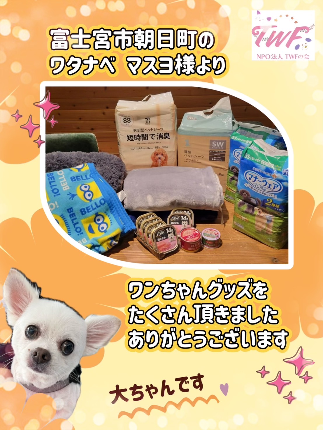 わんちゃんグッズをたくさん寄付して頂きました。 2025 9/17 INFORMATION Thanks! 2025年9月17日 富士宮市朝日町のワタナベマスヨ様より、わんちゃんグッズをたくさん寄付して頂きました。ワタナベ様、ありがとうございます✨ INFORMATION Thanks! よかったらシェアしてね! URLをコピーしました! わんちゃんのご飯などご寄付頂きました ドックフードを頂きました。 おすすめ記事 品物のご寄付を頂きました 2026年2月7日 品物のご寄付を頂きました 2026年2月6日 大切なお知らせ 2026年2月6日 ご寄付を頂きました✨ 2026年1月28日 ご寄付を頂きました 2026年1月26日 品物のご寄付いただきました✨ 2026年1月25日 オレンジX、ごみ袋をご寄付頂きました 2026年1月24日 品物のご寄付を頂きました。 2026年1月20日