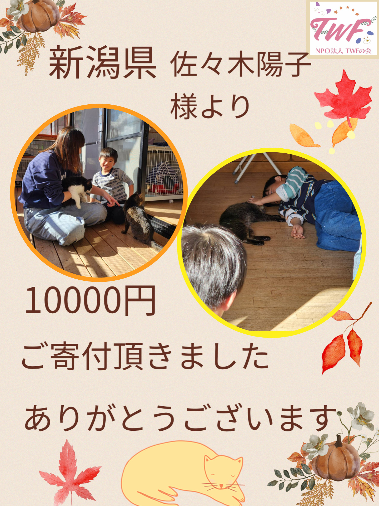 ご寄付を頂きました。 2025 10/29 INFORMATION Thanks! 2025年10月29日 佐々木陽子様より10000円、ご寄付頂きました。ありがとうございます。 INFORMATION Thanks! よかったらシェアしてね! URLをコピーしました! 猫ちゃんのフード、キャリー等たくさんのお品をご寄付頂きました 猫ちゃんのおやつをご寄付頂きました おすすめ記事 品物のご寄付を頂きました 2026年2月7日 品物のご寄付を頂きました 2026年2月6日 大切なお知らせ 2026年2月6日 ご寄付を頂きました✨ 2026年1月28日 ご寄付を頂きました 2026年1月26日 品物のご寄付いただきました✨ 2026年1月25日 オレンジX、ごみ袋をご寄付頂きました 2026年1月24日 品物のご寄付を頂きました。 2026年1月20日