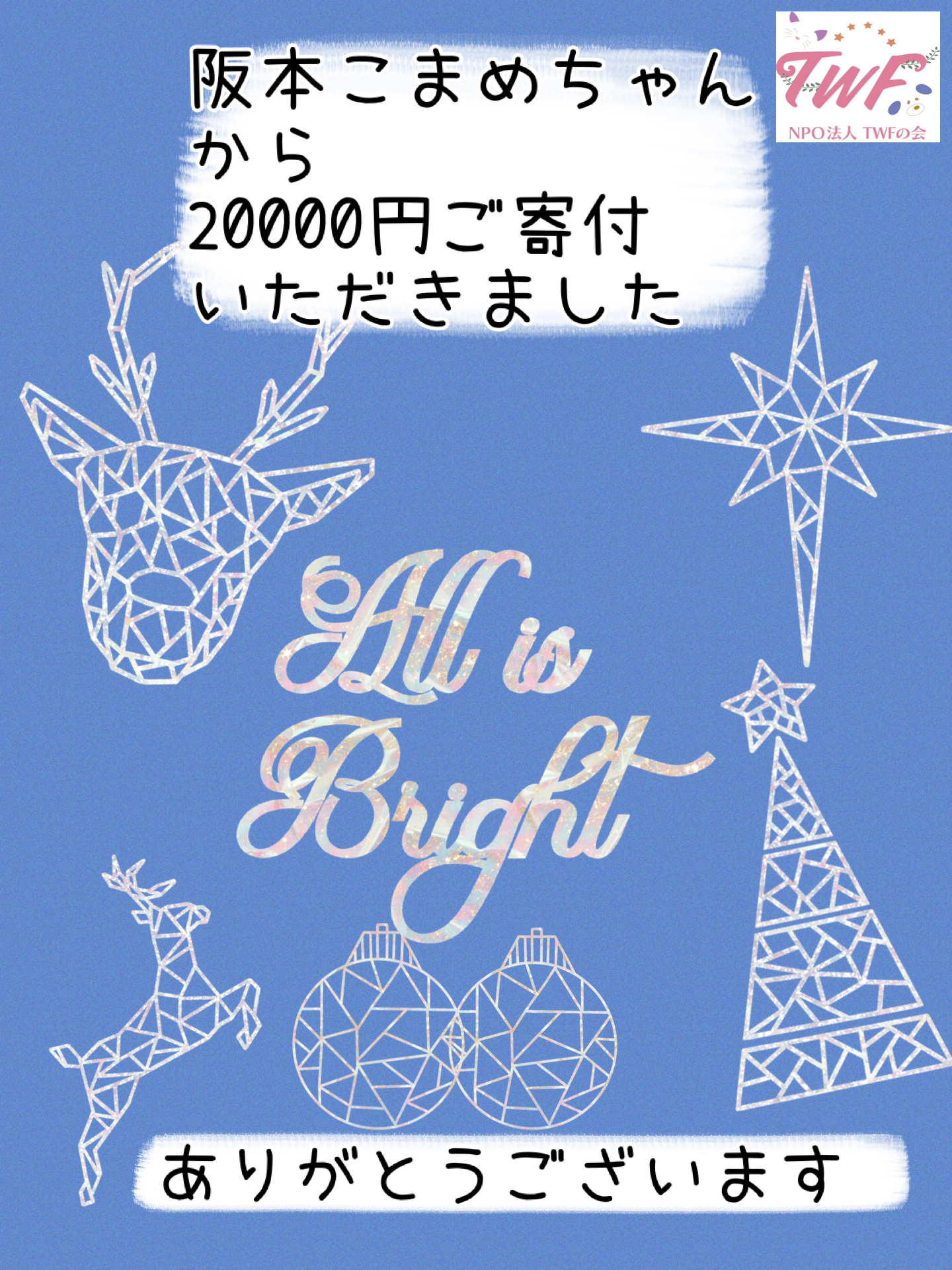 阪本こまめちゃんから、20000円ご寄付いただきました。ありがとうございます。