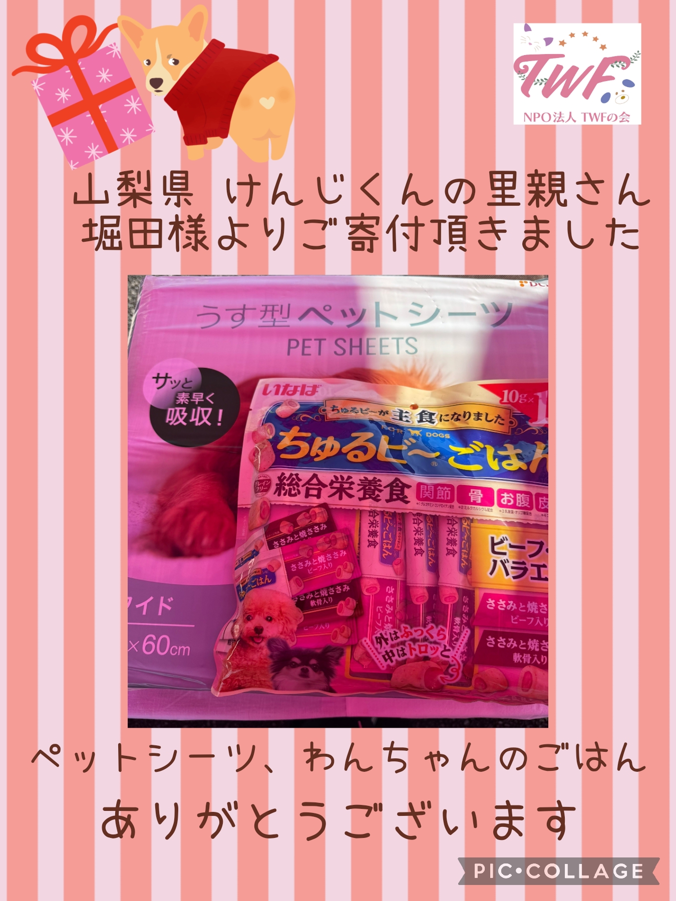 山梨県  けんじくんの里親さん堀田様よりご寄付頂きました。ペットシーツ、わんちゃんのごはんをありがとうございます。