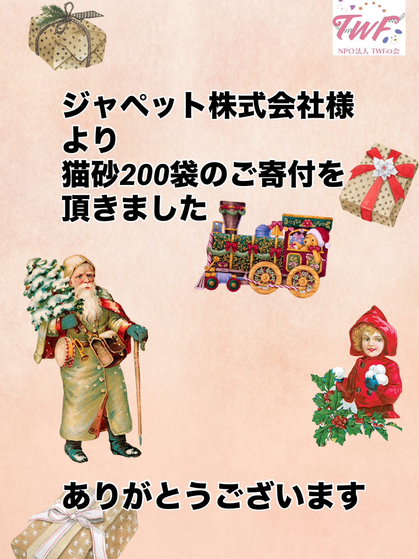 物品のご寄付を頂きました。 2025 11/21 INFORMATION Thanks! 2025年11月21日 ジャペット株式会社様より、猫砂200袋をご寄付頂きました。助かります。いつもありがとうございます。 INFORMATION Thanks! よかったらシェアしてね! URLをコピーしました! ご寄付を頂きました 第4回にゃんこリラッサンテを12月7日(日)に開催致します おすすめ記事 寄付金を頂きました 2026年3月24日 ゴミ袋のご寄付を頂きました 2026年3月22日 品物のご寄付を頂きました 2026年3月20日 【ご寄付を頂きました】 2026年3月20日 寄付金を頂きました 2026年3月20日 寄付金を頂きました 2026年3月20日 3月8日(日)第5回にゃんこリラッサンテを開催致しました 2026年3月18日 寄付金を頂きました 2026年3月16日