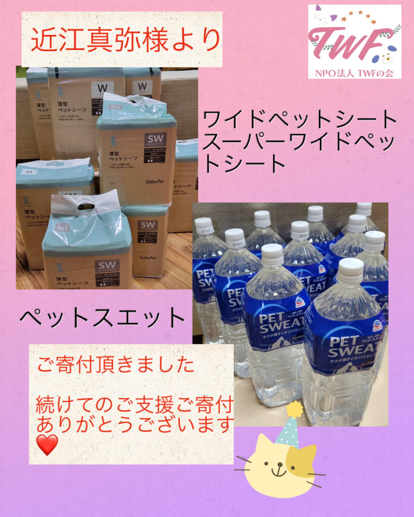 里親様の近江真弥様よりペットシートや、ペットスエットをご寄付頂きました。近江... -