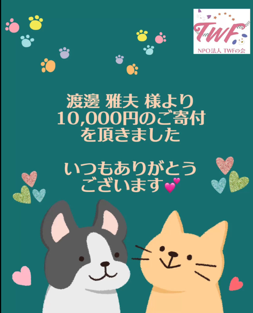 しんどうわかば様より、振込で10,000 円をご寄付頂きました。動物たちのために大事...