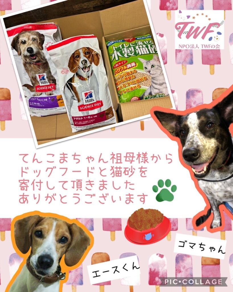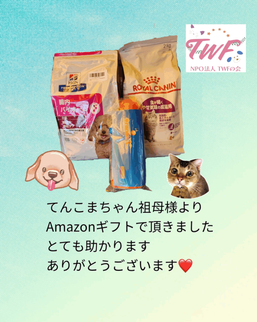 Amazonギフトより、ドックフード、キャットフード、オレンジエックスをご寄付頂き... -